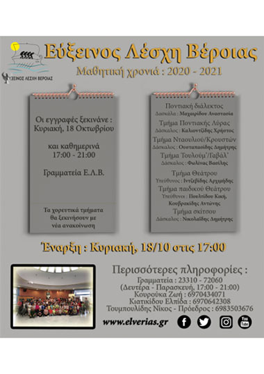 Οι εγγραφές άρχισαν στη Γραμματεία της λέσχης και τα μαθήματα θα πραγματοποιούνται στο Πνευματικό Πολιτιστικό Κέντρο της Λέσχης, στο Πανόραμα Βέροιας ( Λ. Πορφύρα 1).
