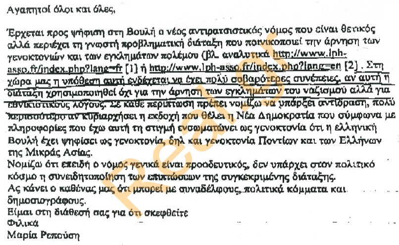 Πλήρης επιβεβαίωση του Real.gr για το περιεχόμενο των όσων αναφέρει η βουλευτής της ΔΗΜΑΡ για την γενοκτονία. Πρόκειται για επιστολή της βουλευτή της ΔΗΜΑΡ Μαρίας Ρεπούση προς την Επιτροπή Δικαιωμάτων του ΣΥΡΙΖΑ.